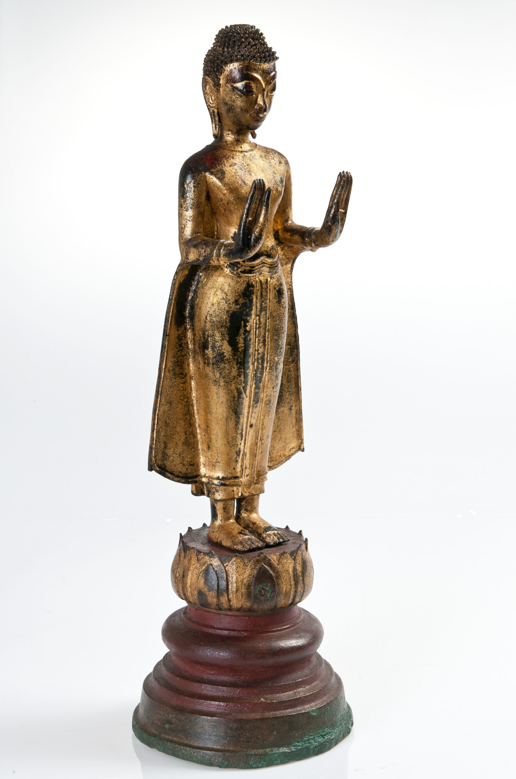 Posąg został wykonany ze złoconego brązu, podobnie jak wiele posągów północnej Tajlandii. Podstawowym składem brązu jest połączenie cyny i miedzi. Do podstawowych składników rzeźbiarze z Północy często dodawali inne metale, takie jak złoto, srebro i ołów. Mieszanka brązu zwana samrit była szczególnie ceniona. Miała ona głęboki ciemnoczekoladowy, niemal czarny kolor. Pomimo piękna tego materiału większość posągów została pozłocona. Figura przedstawia stojącego Buddę, wykonującego gest rozpraszania strachu (abhaya mudra), który w Azji Południowo-Wschodniej wykonywany jest za pomocą obu rąk, z wzniesionymi dłońmi, wyprostowanymi palcami i kciukiem. Symbolizuje on brak strachu oraz opiekę. Na czubku głowy postaci znajduje się charakterystyczne wybrzuszenie – usznisza, która w buddyjskiej ikonografii jest właściwa wizerunkom Buddy i bodhisattwów i symbolizuje ich oświecenie. Budda nosi szatę mnicha. Głowa Buddy ma głowę pokrytą przylegającymi do głowy loczkami. Inną charakterystyczną cechą figur Buddy są rozciągnięte płatki uszu. Przypominają one o królewskim pochodzeniu Buddy. Jako młody książę Siddhartha nosił ciężkie kolczyki, których ciężar wydłużał płatki uszu. Stając się ascetą, zamienił bogate sukno i cenną biżuterię na prostą szatę zakonną. Uszy pozostały wydłużone, co świadczy o odrzuceniu ziemskich bogactw. W Tajlandii zazwyczaj przedstawiano szatę jako przezroczystą, która pozwala prześwitywać nadludzkiej naturze ciała Buddy. Podstawy posągów najczęściej zdobiono motywem płatków lotosu. Przez wieki lotos był kojarzony z Buddą, który używał kwiatu jako metafory nauczania: lotos reprezentuje transcendencję – pączek wyrasta z błota, aby otworzyć się czystym w powietrzu, tak jak oświecona istota podnosi się z bagna ziemskich złudzeń, aby osiągnąć rozrzedzoną atmosferę pełnego zrozumienia.