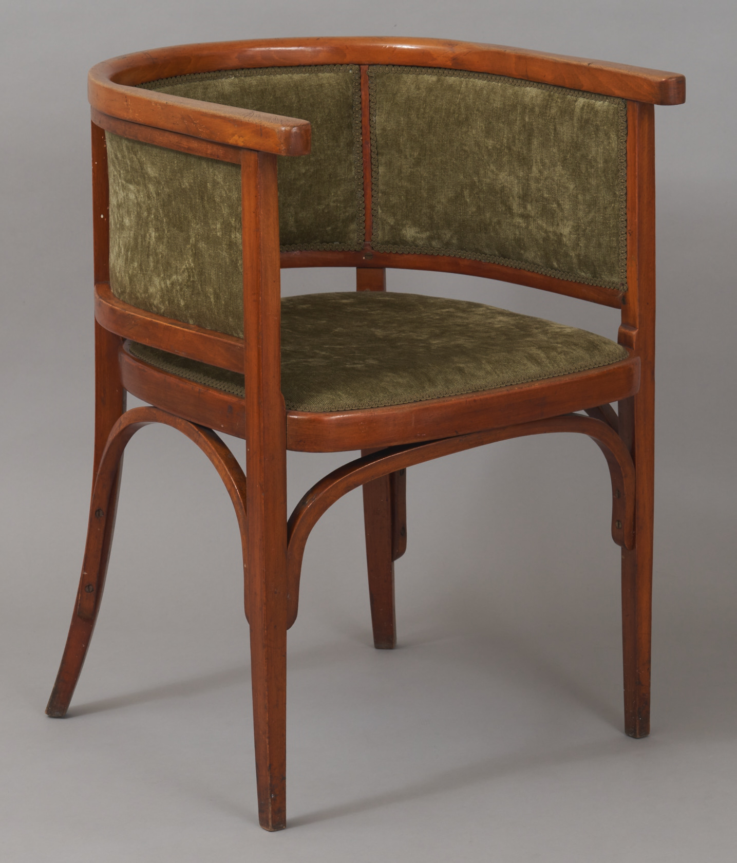 Krzesło podparte na czterech nogach o przekroju kwadratowym, z których tylne wygięte są nieco na zewnątrz. Przednie nogi wzmocnione wygiętym łukowato kabłąkiem przytwierdzonym brzuścem do ramy siedziska. W analogiczny sposób połączono nogi tylne z przednimi. Siedzisko w kształcie zaokrąglonego na rogach kwadratu (silniej z tyłu), wyściełane zieloną, welurową tkaniną. Ramę oparcia i poręczy, stanowiących jedną całość, wyznaczają przedłużone nogi. Pokrywają ją trzy prostokątne bryty materii analogicznej do tej z siedziska.