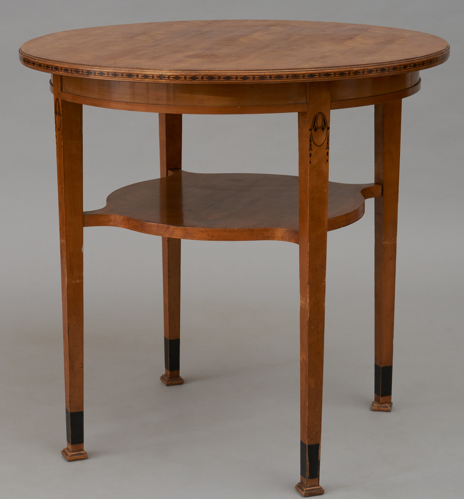 Oskrzynienie wsparte na czterech smukłych, zwężających się ku dołowi nogach. Nogi w połowie wysokości powiązane łączyną, spełniającą rolę półki. Półka kwadratowa o falistych bokach. Oskrzynienie proste. Krawędź blatu intrasjowana wzorem żyłkowym w romby. Górna zewnętrzna krawędź nogi intarsjowana symetrycznym elementemzawartym w owalu. Dolna część nogi intrasjowana z cztrech stron. Nogi ustawione na kwadratowych stopkach o żłobionych krawędziach.